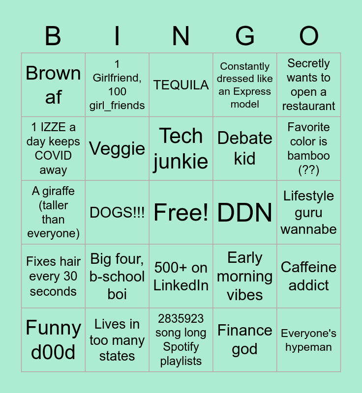 This bingo card has a free space and 24 words: Big four, b-school boi, Lives in too many states, Tech junkie, Funny d00d, Secretly wants to open a restaurant, Brown af, 1 IZZE a day keeps COVID away, 1 Girlfriend, 100 girl_friends, DDN, 500+ on LinkedIn, Debate kid, A giraffe (taller than everyone), Early morning vibes, Caffeine addict, Veggie, Finance god, Lifestyle guru wannabe, TEQUILA, Favorite color is bamboo (??), DOGS!!!, Everyone's hypeman, Fixes hair every 30 seconds, Constantly dressed like an Express model and 2835923 song long Spotify playlists.