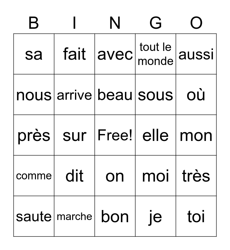 This bingo card has a free space and 30 words: marche, dans, sur, pour, sa, avec, arrive, on, elle, bon, mon, toi, je, si, où, au, moi, comme, dit, aussi, près, en, fait, sous, nous, tout le monde, très, saute, beau and rit.