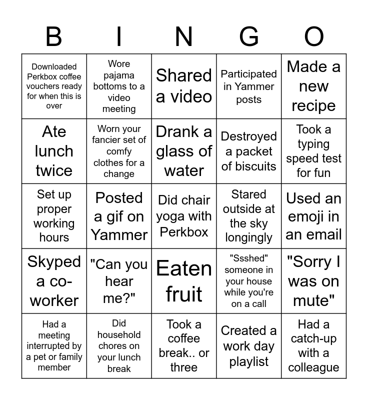 This bingo card has a free space and 24 words: "Can you hear me?", Did household chores on your lunch break, Drank a glass of water, Had a meeting interrupted by a pet or family member, Made a new recipe, Downloaded Perkbox coffee vouchers ready for when this is over, Ate lunch twice, Wore pajama bottoms to a video meeting, Stared outside at the sky longingly, Eaten fruit, Destroyed a packet of biscuits, Set up proper working hours, "Ssshed" someone in your house while you're on a call, "Sorry I was on mute", Worn your fancier set of comfy clothes for a change, Created a work day playlist, Used an emoji in an email, Shared a video, Took a typing speed test for fun, Posted a gif on Yammer, Had a catch-up with a colleague, Skyped a co-worker, Participated in Yammer posts and Took a coffee break.. or three.