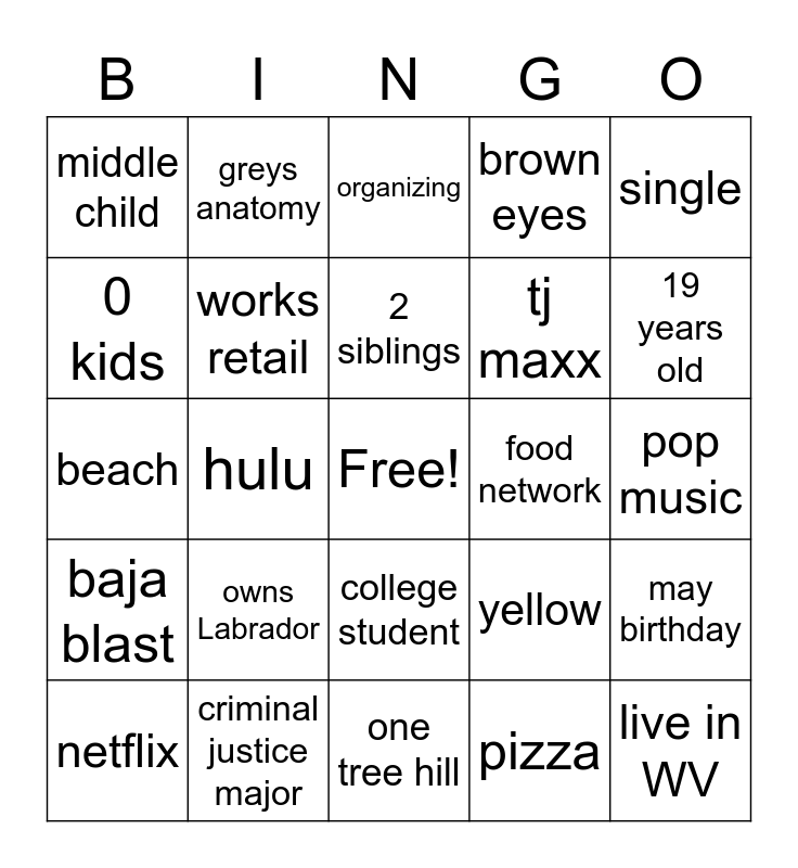 This bingo card has a free space and 24 words: netflix, owns Labrador, 2 siblings, pizza, single, middle child, greys anatomy, organizing, food network, pop music, beach, works retail, yellow, may birthday, 0 kids, criminal justice major, one tree hill, brown eyes, 19 years old, baja blast, hulu, college student, tj maxx and live in WV.