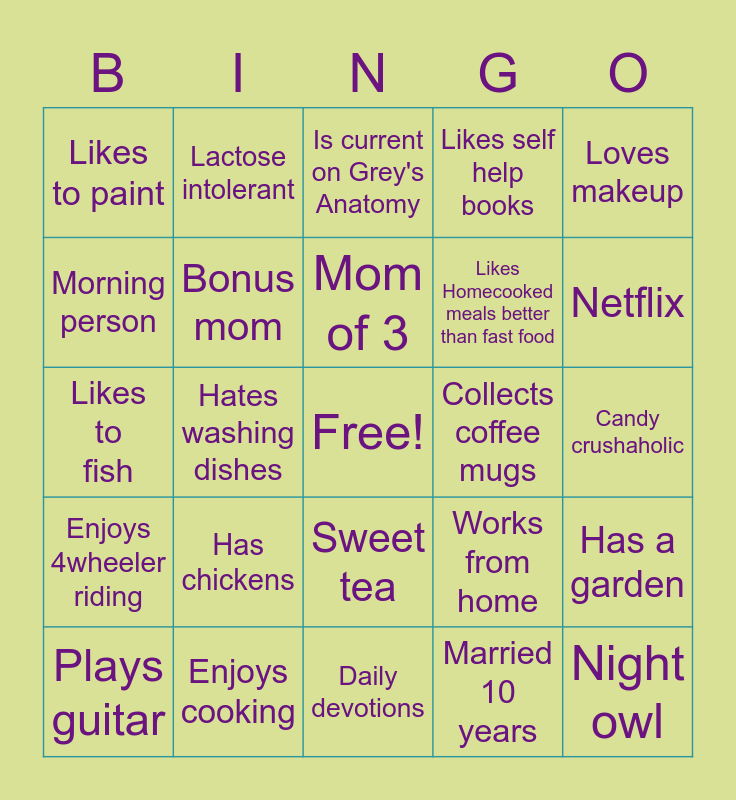 This bingo card has a free space and 24 words: Plays guitar, Has chickens, Mom of 3, Married 10 years, Loves makeup, Likes to paint, Lactose intolerant, Is current on Grey's Anatomy, Collects coffee mugs, Candy crushaholic, Likes to fish, Bonus mom, Works from home, Has a garden, Morning person, Enjoys cooking, Daily devotions, Likes self help books, Netflix, Enjoys 4wheeler riding, Hates washing dishes, Sweet tea, Likes Homecooked meals better than fast food and Night owl.