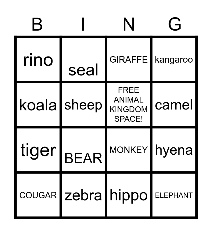This bingo card has 19 words: MONKEY, lion, GIRAFFE, ELEPHANT, hyena, koala, hippo, rino, seal, tiger, BEAR, sheep, FREE ANIMAL KINGDOM SPACE!, zebra, COUGAR, bison, kangaroo, camel and gorilla.