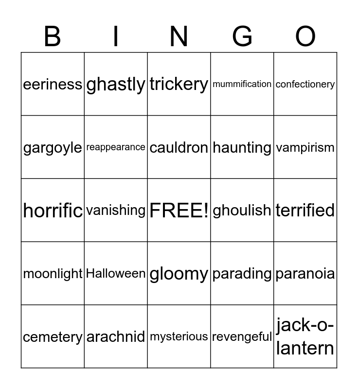 This bingo card has a free space and 24 words: Halloween, arachnid, cauldron, cemetery, confectionery, eeriness, gargoyle, ghastly, ghoulish, gloomy, haunting, horrific, parading, paranoia, reappearance, revengeful, terrified, trickery, vampirism, vanishing, jack-o-lantern, moonlight, mummification and mysterious.