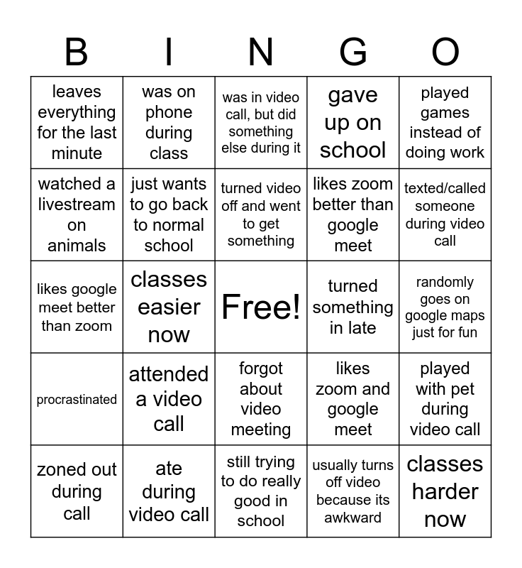 This bingo card has a free space and 24 words: attended a video call, ate during video call, turned video off and went to get something, zoned out during call, played games instead of doing work, leaves everything for the last minute, watched a livestream on animals, was on phone during class, turned something in late, forgot about video meeting, likes zoom better than google meet, likes google meet better than zoom, likes zoom and google meet, played with pet during video call, just wants to go back to normal school, usually turns off video because its awkward, randomly goes on google maps just for fun, was in video call, but did something else during it, texted/called someone during video call, classes easier now, classes harder now, procrastinated, gave up on school and still trying to do really good in school.