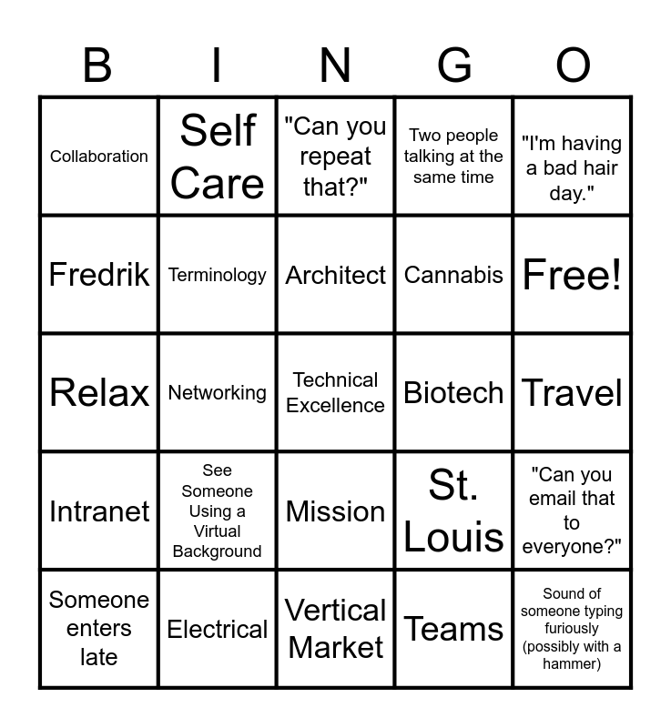 This bingo card has 180 words: Flysheet, Ghost Writer, Stuttgart, Food+ Beverage, Terminology, Core Team, Town Hall, Vision, Twitter, ONEsolution, See a Child in Background, Operations, Free!, Comment on someone's hair, Fredrik, Band Width, Vertical Market, Microsoft Dynamics, Linked In Learning, MARKETING PLAN, MARKETING STRATEGY, Remapping, Messaging, Project Manager, Muted to Talk to Family, OSD, Vaccine, Someone Sneezes, See Someone Using a Virtual Background, Sales Services, Search Engine Optimization (SEO), Vacation, Quarantine, Temp Number, Regional Leader, Communications, Voluncheer, Yammer, Safety, Collateral, Single Source of Truth, Searchable, Intranet, Yammer, Goals, Travel, Award, Library, Archive, Technical Advancement Group (TAG), Initiative, Swamped, Relax, Self Care, Family, Weekend, Corporate, Midwest, Central, West, Biotech, Northeast, Southeast, Ryan Schroeder, Jeff Biskup, Basel, Canada, Puerto Rico, Oakland, Denver, Boston, Philly, Rockville, Raleigh, Kalamazoo, Marshfield, St. Louis, Dallas, Kansas City, Denver, San Diego, Orange County, Oakland, Caribe, Europe, Insurance, Admin, Legal, See someone wearing a hat, Grammar, Discipline, Architect, Engineer, Construction, Job Site, LinkedIn Post, Tired, See Someone Drinking Coffee/Tea, Zoom, Teams, InDesign, PowerPoint, Excel, Skype, OneNote, SMPS, Shipley, Networking, Birthday, Anniversary, Growth, Career Path, Interview, Fun, Core Values, Client Satisfaction, Survey, Business Development, Conference, Vision, Mission, Technical Excellence, Responsibility, Entrepreneurial Spirit, Collaboration, Accounting, HR, IT, Quality, Mechanical, Cannabis, Electrical, Testing, Beta, Sustainable, Template, BIM, Process, Simulation, Manual, "Can you email that to everyone?", "Is ____ on the call?", Win-win, "I think we're all on the same page.", "Sorry guys, I've got to jump to another call.", Sound of someone typing furiously (possibly with a hammer), "_____, you're on mute.", "Can you all see my screen?", Super loud echo/ feedback, Hear a barking dog, Someone enters late, Someone is eating, Two people talking at the same time, Someone keeps dropping out, "Can you repeat that?", Sirens in background, Awkward Silence, Action Items, Xena Warrior Princess, See a dog, See a cat, Coughing, "___ can you comment?", Uncontrollable Laughter, "This is fun!", "I'll look into it.", Deep Dive, "Let's play it by ear.", "Can we take this offline?", Goals, Manufacturing Facility, Research Facility, Laboratory, "I'm having a bad hair day.", Fast Track, Target Audience, "That's about it.", Forgot Something, Deadline and Podcast.
