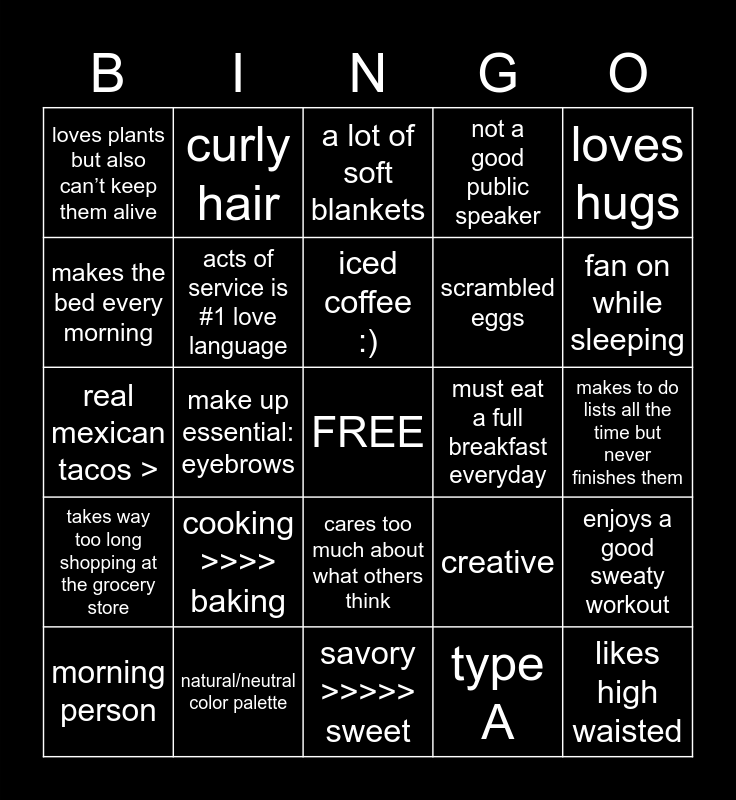 This bingo card has a free space and 24 words: morning person, cooking >>>> baking, iced coffee :), type A, loves hugs, loves plants but also can’t keep them alive, curly hair, a lot of soft blankets, must eat a full breakfast everyday, makes to do lists all the time but never finishes them, real mexican tacos >, acts of service is #1 love language, creative, enjoys a good sweaty workout, makes the bed every morning, natural/neutral color palette, savory >>>>> sweet, not a good public speaker, fan on while sleeping, takes way too long shopping at the grocery store, make up essential: eyebrows, cares too much about what others think, scrambled eggs and likes high waisted.