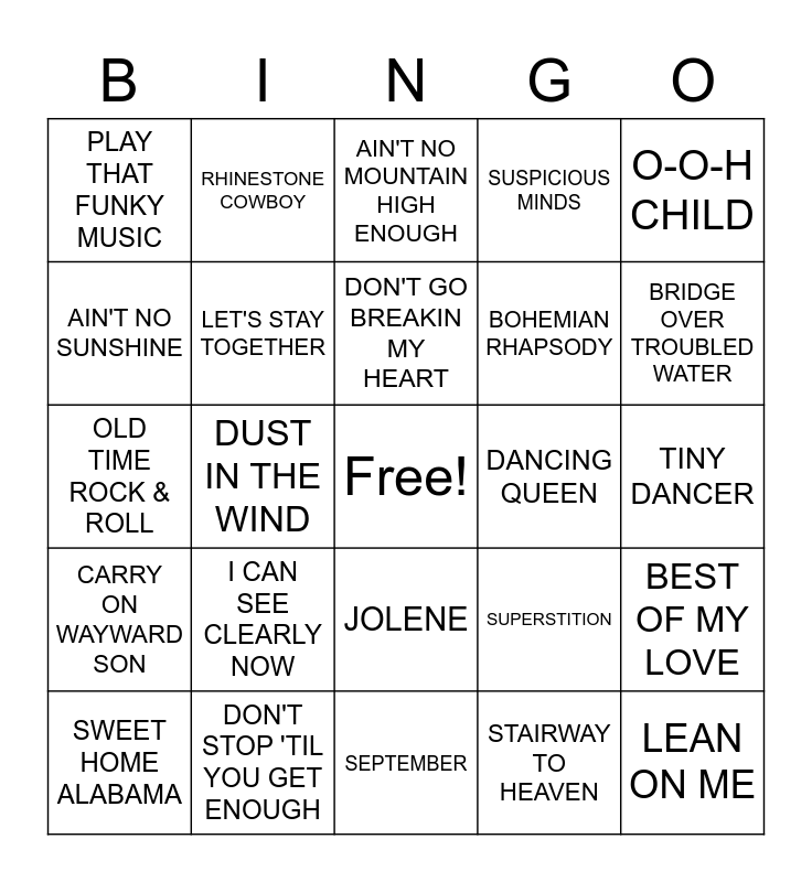 This bingo card has a free space and 34 words: COME AND GET YOUR LOVE, STAIRWAY TO HEAVEN, ALL BY MYSELF, COUNTRY ROADS, CARRY ON WAYWARD SON, LET'S STAY TOGETHER, O-O-H CHILD, SWEET HOME ALABAMA, RHINESTONE COWBOY, BENNIE AND THE JETS, DON'T GO BREAKIN MY HEART, AIN'T NO MOUNTAIN HIGH ENOUGH, STAYIN' ALIVE, I FEEL THE EARTH MOVE, DANCING QUEEN, BRIDGE OVER TROUBLED WATER, DON'T STOP 'TIL YOU GET ENOUGH, OLD TIME ROCK & ROLL, I CAN SEE CLEARLY NOW, SUPERSTITION, JOLENE, I WILL SURVIVE, PLAY THAT FUNKY MUSIC, TINY DANCER, SEPTEMBER, LEAN ON ME, SUSPICIOUS MINDS, HERE COMES THE SUN, BOHEMIAN RHAPSODY, AIN'T NO SUNSHINE, LOVE REALLY HURTS WITHOUT YOU, DUST IN THE WIND, BEST OF MY LOVE and THE CHAIN.