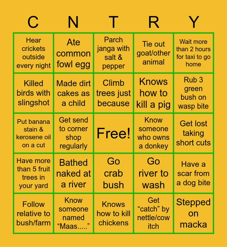This bingo card has a free space and 24 words: Bathed naked at a river, Know someone named “Maas.....”, Climb trees just because, Follow relative to bush/farm, Wait more than 2 hours for taxi to go home, Hear crickets outside every night, Killed birds with slingshot, Ate common fowl egg, Know someone who owns a donkey, Go crab bush, Knows how to kill a pig, Put banana stain & kerosene oil on a cut, Go river to wash, Have a scar from a dog bite, Made dirt cakes as a child, Get “catch” by nettle/cow itch, Get lost taking short cuts, Parch janga with salt & pepper, Rub 3 green bush on wasp bite, Get send to corner shop regularly, Stepped on macka, Have more than 5 fruit trees in your yard, Tie out goat/other animal and Knows how to kill chickens.