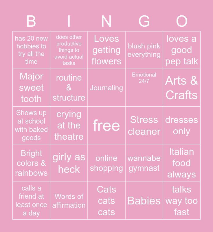 This bingo card has a free space and 24 words: girly as heck, Words of affirmation, Journaling, calls a friend at least once a day, loves a good pep talk, has 20 new hobbies to try all the time, Major sweet tooth, does other productive things to avoid actual tasks, Stress cleaner, online shopping, Emotional 24/7, Shows up at school with baked goods, wannabe gymnast, Italian food always, routine & structure, Babies, dresses only, Loves getting flowers, Arts & Crafts, crying at the theatre, talks way too fast, Bright colors & rainbows, blush pink everything and Cats cats cats.