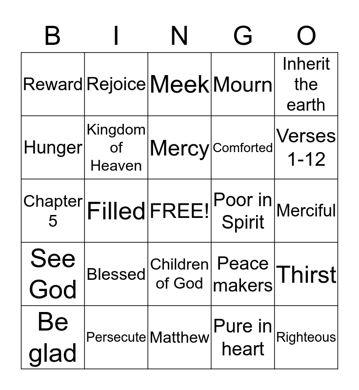 This bingo card has a free space and 24 words: Blessed, Persecute, Mercy, Be glad, Inherit the earth, Reward, Hunger, Rejoice, Poor in Spirit, Children of God, Comforted, Chapter 5, Peace makers, Thirst, Kingdom of Heaven, Pure in heart, Merciful, Meek, Verses 1-12, Filled, Righteous, See God, Mourn and Matthew.