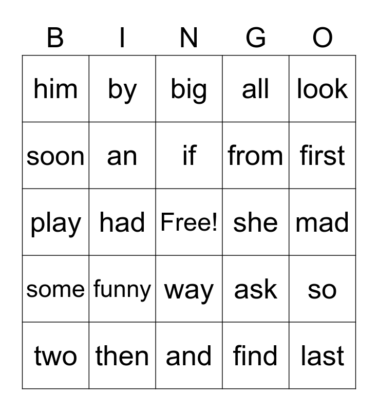 This bingo card has a free space and 24 words: funny, then, if, two, look, him, soon, by, she, way, from, play, ask, so, an, find, mad, big, first, had, last, some, all and and.