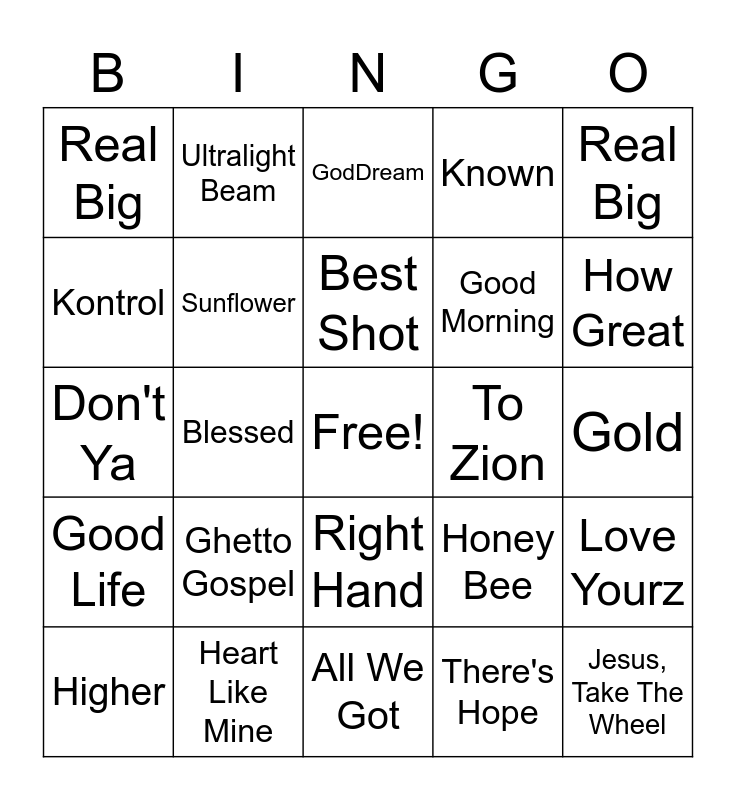 This bingo card has a free space and 24 words: Ghetto Gospel, Heart Like Mine, Best Shot, Higher, Real Big, Real Big, Kontrol, Ultralight Beam, To Zion, Right Hand, Good Morning, Don't Ya, Honey Bee, Love Yourz, Sunflower, There's Hope, Gold, GodDream, How Great, Blessed, Jesus, Take The Wheel, Good Life, Known and All We Got.