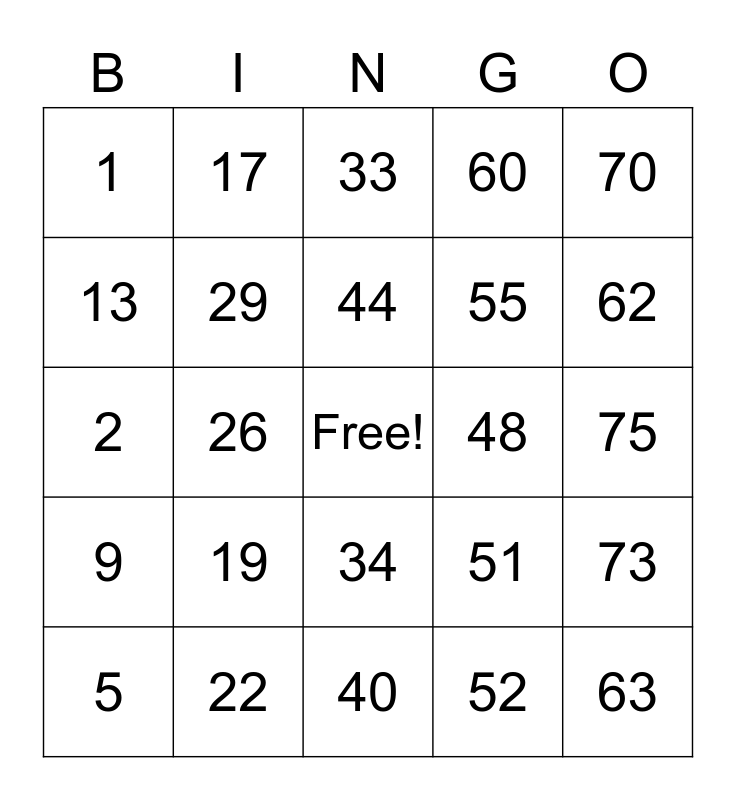 This bingo card has a free space and 24 words: 5, 19, 44, 52, 70, 1, 17, 33, 48, 75, 2, 29, 51, 73, 13, 22, 40, 60, 62, 9, 26, 34, 55 and 63.
