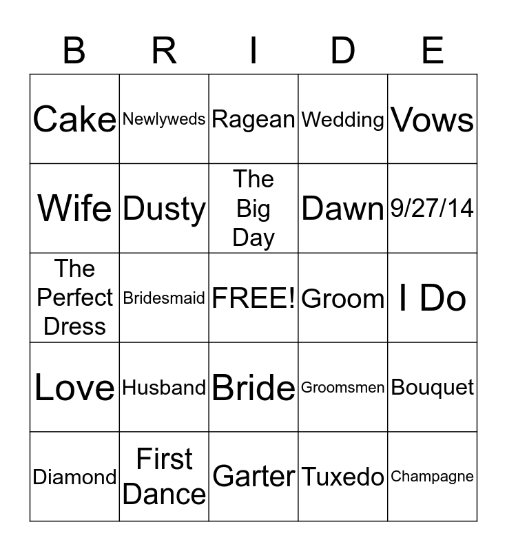 This bingo card has a free space and 24 words: Husband, First Dance, The Big Day, Diamond, Vows, Cake, Wife, Newlyweds, Groom, Bride, Dawn, The Perfect Dress, Groomsmen, Bouquet, Dusty, Tuxedo, I Do, Ragean, 9/27/14, Bridesmaid, Champagne, Love, Wedding and Garter.