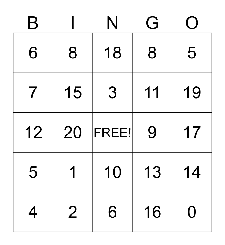 This bingo card has a free space and 24 words: 1, 2, 3, 4, 5, 6, 7, 8, 9, 10, 11, 12, 13, 14, 15, 16, 17, 18, 19, 20, 0, 5, 8 and 6.