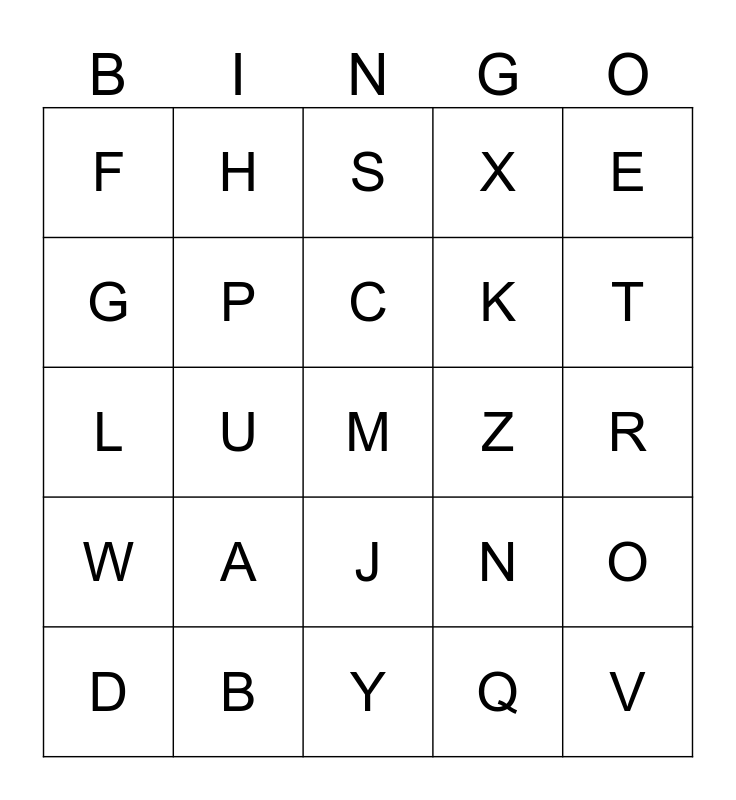 This bingo card has a free space and 24 words: A, B, C, D, E, F, G, H, Z, J, K, L, N, O, P, Q, R, S, T, U, V, W, X and Y.