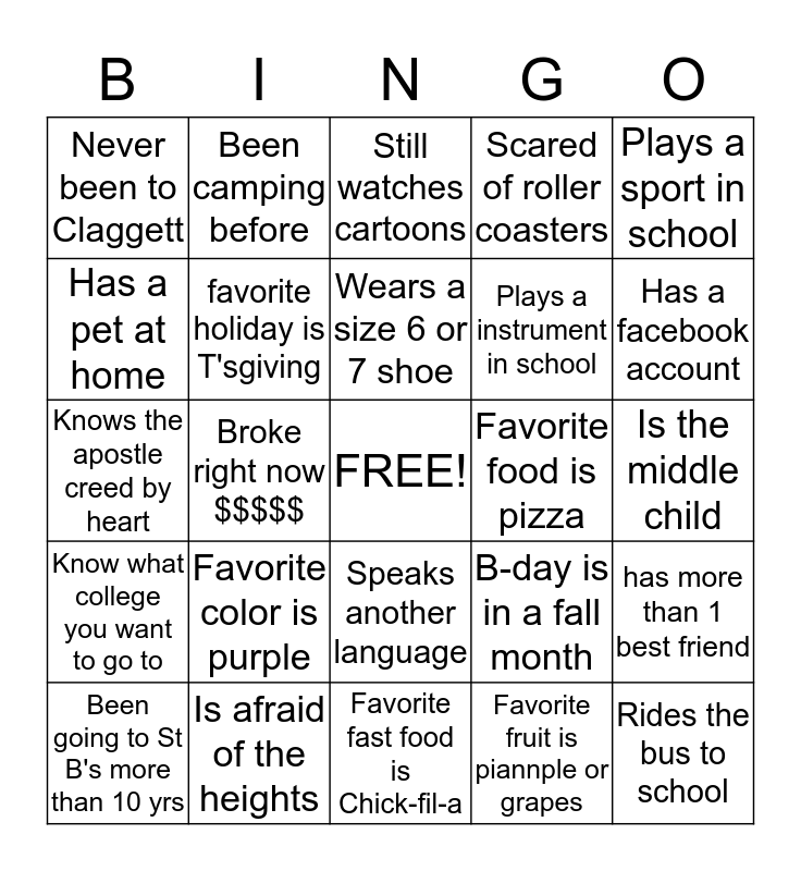 This bingo card has a free space and 24 words: Favorite color is purple, Is afraid of the heights, Wears a size 6 or 7 shoe, Been going to St B's more than 10 yrs, Plays a sport in school, Never been to Claggett, Has a pet at home, Been camping before, Favorite food is pizza, Speaks another language, Plays a instrument in school, Knows the apostle creed by heart, B-day is in a fall month, has more than 1 best friend, favorite holiday is T'sgiving, Favorite fruit is piannple or grapes, Is the middle child, Still watches cartoons, Has a facebook account, Broke right now $$$$$, Rides the bus to school, Know what college you want to go to, Scared of roller coasters and Favorite fast food is Chick-fil-a.