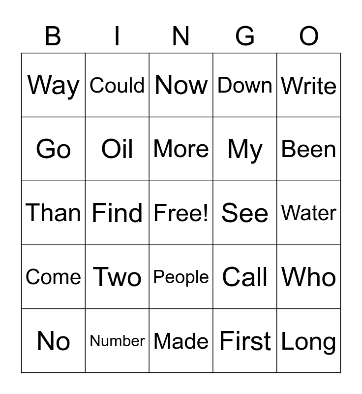 This bingo card has a free space and 24 words: Two, Number, More, No, Write, Way, Go, Could, See, People, My, Than, Call, Who, Oil, First, Water, Now, Been, Find, Long, Come, Down and Made.