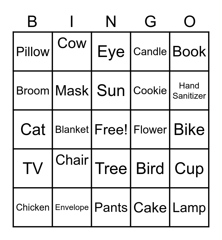 This bingo card has a free space and 40 words: Dog, Cat, Ball, Mask, Envelope, Tree, Sun, Star, Book, TV, Blanket, Candle, Lamp, Bike, Flower, Chair, Hand, Pillow, Foot, Eye, Cup, Cake, Cookie, Broom, Snake, Car, Road, Music Note, Snowflake, Snowman, House, Chicken, Horse, Bird, Hand Sanitizer, Pants, Apple, Stick Person, Cow and Pig.