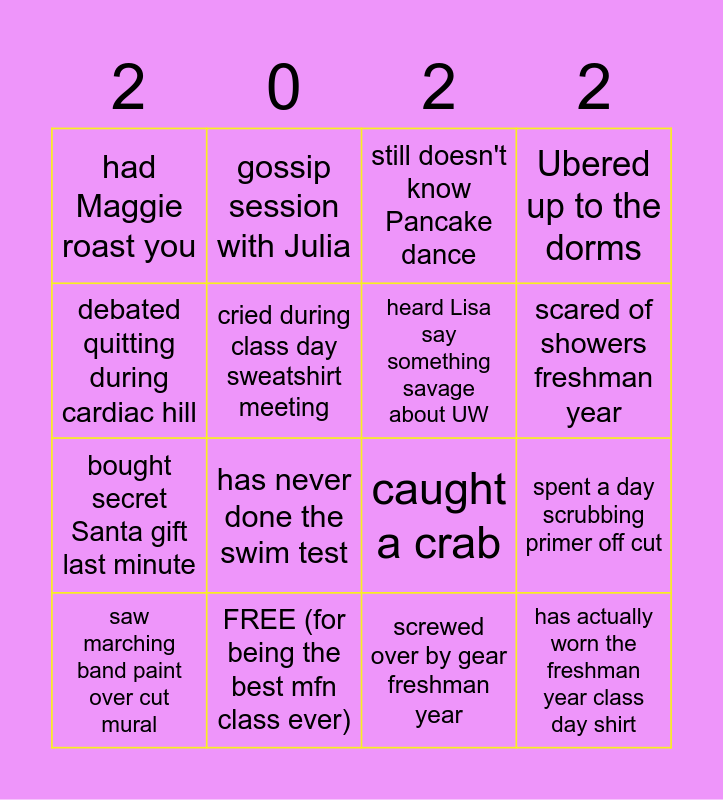 This bingo card has 16 words: FREE (for being the best mfn class ever), spent a day scrubbing primer off cut, still doesn't know Pancake dance, had Maggie roast you, bought secret Santa gift last minute, gossip session with Julia, caught a crab, screwed over by gear freshman year, debated quitting during cardiac hill, cried during class day sweatshirt meeting, saw marching band paint over cut mural, Ubered up to the dorms, has never done the swim test, scared of showers freshman year, heard Lisa say something savage about UW and has actually worn the freshman year class day shirt.