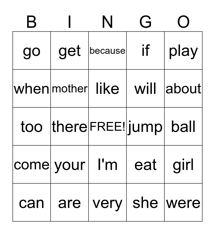 This bingo card has a free space and 24 words: your, are, like, can, play, go, when, get, jump, I'm, will, too, eat, girl, mother, she, ball, because, about, there, were, come, if and very.