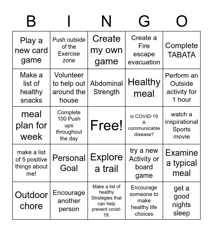 This bingo card has a free space and 24 words: Personal Goal, Encourage another person, Abdominal Strength, Outdoor chore, Complete TABATA, Play a new card game, Make a list of healthy snacks, Push outside of the Exercise zone, is COVID-19 A communicable disease?, Explore a trail, Healthy meal, meal plan for week, try a new Activity or board game, Examine a typical meal, Volunteer to help out around the house, Encourage someone to make healthy life choices, watch a inspirational Sports movie, Create my own game, Perform an Outside activity for 1 hour, Complete 100 Push ups throughout the day, get a good nights sleep, make a list of 5 positive things about me!, Create a Fire escape evacuation and Make a list of healthy Strategies that can help prevent covid-19..