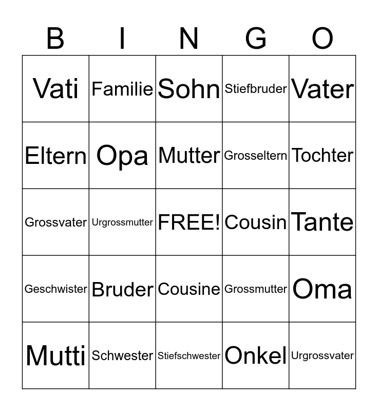 This bingo card has a free space and 24 words: Bruder, Schwester, Mutter, Mutti, Vater, Vati, Eltern, Familie, Cousin, Cousine, Grosseltern, Grossvater, Grossmutter, Oma, Opa, Onkel, Tante, Sohn, Tochter, Urgrossmutter, Urgrossvater, Geschwister, Stiefbruder and Stiefschwester.