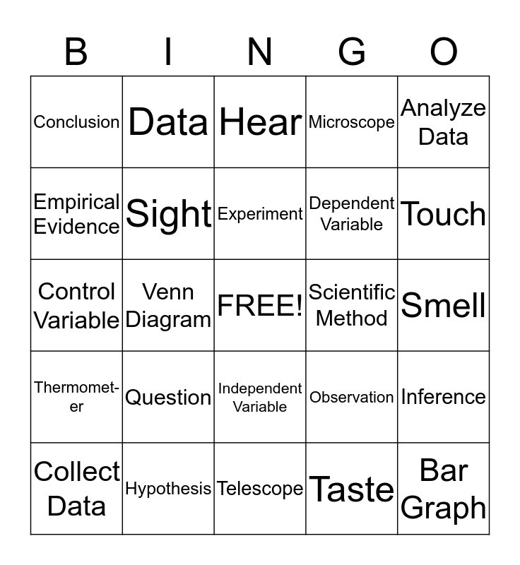 This bingo card has a free space and 24 words: Question, Hypothesis, Experiment, Collect Data, Analyze Data, Conclusion, Empirical Evidence, Data, Scientific Method, Independent Variable, Dependent Variable, Control Variable, Observation, Inference, Sight, Taste, Smell, Hear, Touch, Venn Diagram, Bar Graph, Thermomet-er, Microscope and Telescope.