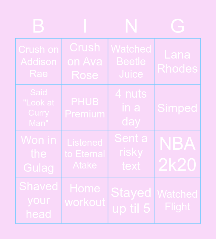 This bingo card has 16 words: Home workout, NBA 2k20, Watched Beetle Juice, Crush on Addison Rae, Won in the Gulag, Crush on Ava Rose, Sent a risky text, Stayed up til 5, Said "Look at Curry Man", PHUB Premium, Shaved your head, Lana Rhodes, Listened to Eternal Atake, Simped, 4 nuts in a day and Watched Flight.