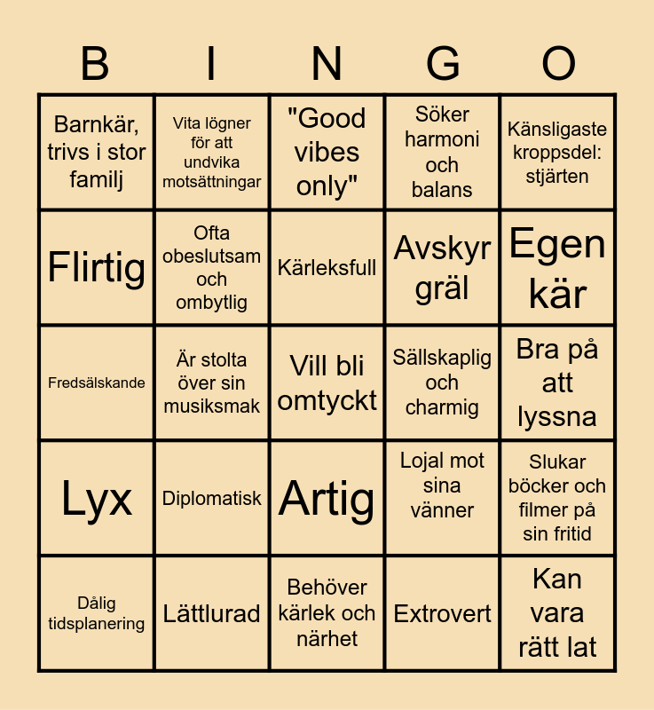 This bingo card has a free space and 24 words: Diplomatisk, Lättlurad, Kärleksfull, Dålig tidsplanering, Känsligaste kroppsdel: stjärten, Barnkär, trivs i stor familj, Flirtig, Vita lögner för att undvika motsättningar, Sällskaplig och charmig, Artig, Avskyr gräl, Fredsälskande, Lojal mot sina vänner, Slukar böcker och filmer på sin fritid, Ofta obeslutsam och ombytlig, Extrovert, Bra på att lyssna, "Good vibes only", Egen kär, Är stolta över sin musiksmak, Kan vara rätt lat, Lyx, Söker harmoni och balans and Behöver kärlek och närhet.