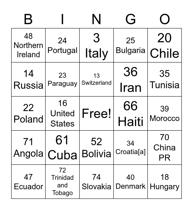This bingo card has a free space and 75 words: 1 Brazil, 2 Germany, 3 Italy, 4 Argentina, 5 Mexico, 6 Spain, 7 France, 8 England, 9 Belgium, 10 Uruguay, 11 Serbia, 12 Sweden, 13 Switzerland, 14 Russia, 15 South Korea, 16 United States, 17 Netherlands, 18 Hungary, 19 Czech Republic, 20 Chile, 21 Scotland, 22 Poland, 23 Paraguay, 24 Portugal, 25 Bulgaria, 26 Cameroon, 27 Romania, 28 Austria, 29 Japan, 30 Nigeria, 31 Colombia, 32 Australia, 33 Saudi Arabia, 34 Croatia[a], 35 Tunisia, 36 Iran, 37 Costa Rica, 38 Peru, 39 Morocco, 40 Denmark, 41 Algeria, 42 Ghana, 43 Ivory Coast, 44 Norway, 45 Honduras, 46 Greece, 47 Ecuador, 48 Northern Ireland, 49 Republic of Ireland, 50 South Africa, 51 Egypt, 52 Bolivia, 53 Senegal, 54 Turkey, 55 North Korea, 56 El Salvador, 57 New Zealand, 58 Slovenia, 59 Iceland, 60 Panama, 61 Cuba, 62 Indonesia, 63 Wales, 64 Israel, 65 DR Congo, 66 Haiti, 67 Kuwait, 68 Canada, 69 Jamaica, 70 China PR, 71 Angola, 72 Trinidad and Tobago, 73 Ukraine, 74 Slovakia and 75 Bosnia and Herzegovina.