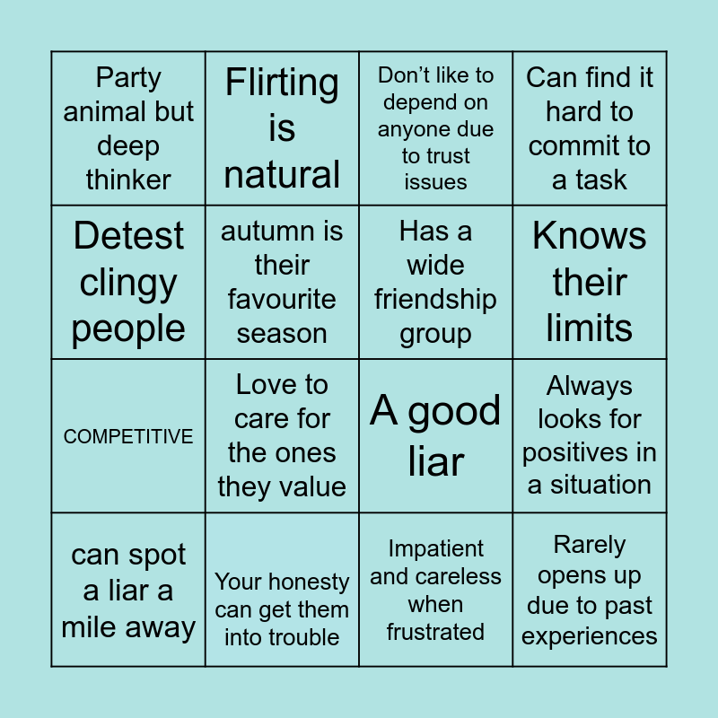 This bingo card has 16 words: Your honesty can get them into trouble, Always looks for positives in a situation, Don’t like to depend on anyone due to trust issues, Party animal but deep thinker, COMPETITIVE, Flirting is natural, A good liar, Impatient and careless when frustrated, Detest clingy people, autumn is their favourite season, can spot a liar a mile away, Can find it hard to commit to a task, Love to care for the ones they value, Knows their limits, Has a wide friendship group and Rarely opens up due to past experiences.
