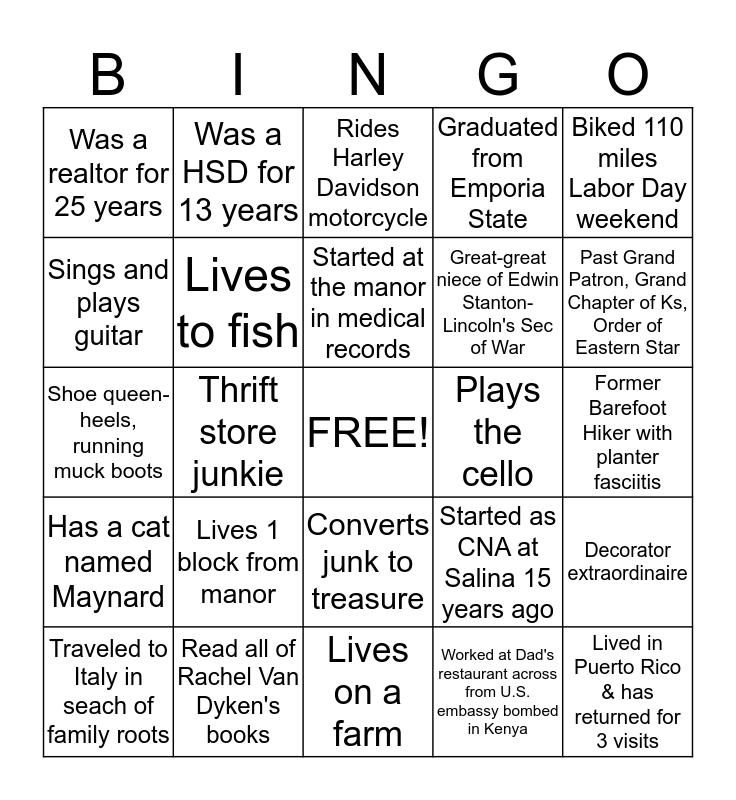 This bingo card has a free space and 24 words: Lives 1 block from manor, Read all of Rachel Van Dyken's books, Started at the manor in medical records, Traveled to Italy in seach of family roots, Biked 110 miles Labor Day weekend, Was a realtor for 25 years, Sings and plays guitar, Was a HSD for 13 years, Plays the cello, Converts junk to treasure, Great-great niece of Edwin Stanton-Lincoln's Sec of War, Shoe queen-heels, running muck boots, Started as CNA at Salina 15 years ago, Decorator extraordinaire, Lives to fish, Worked at Dad's restaurant across from U.S. embassy bombed in Kenya, Former Barefoot Hiker with planter fasciitis, Rides Harley Davidson motorcycle, Past Grand Patron, Grand Chapter of Ks, Order of Eastern Star, Thrift store junkie, Lived in Puerto Rico & has returned for 3 visits, Has a cat named Maynard, Graduated from Emporia State and Lives on a farm.
