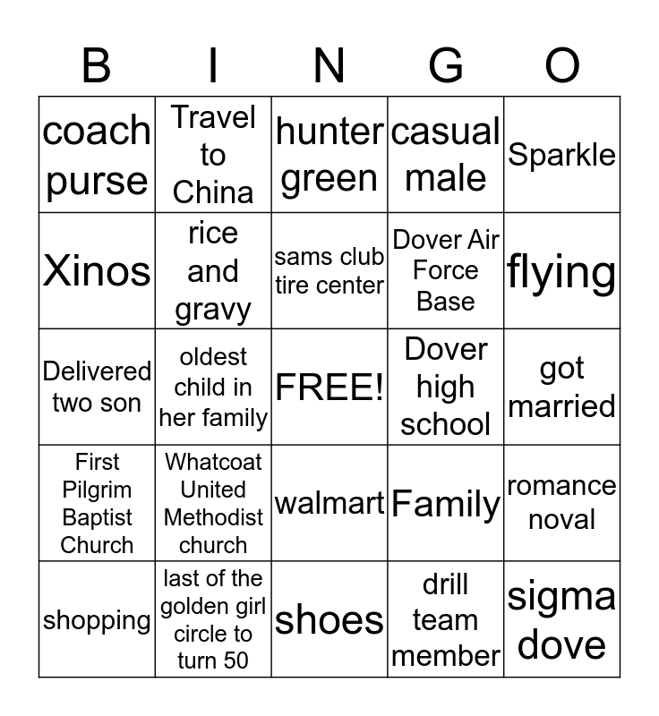 This bingo card has a free space and 24 words: Whatcoat United Methodist church, last of the golden girl circle to turn 50, sams club tire center, shopping, Sparkle, coach purse, Xinos, Travel to China, Dover high school, walmart, Dover Air Force Base, Delivered two son, Family, romance noval, rice and gravy, drill team member, got married, hunter green, flying, oldest child in her family, sigma dove, First Pilgrim Baptist Church, casual male and shoes.