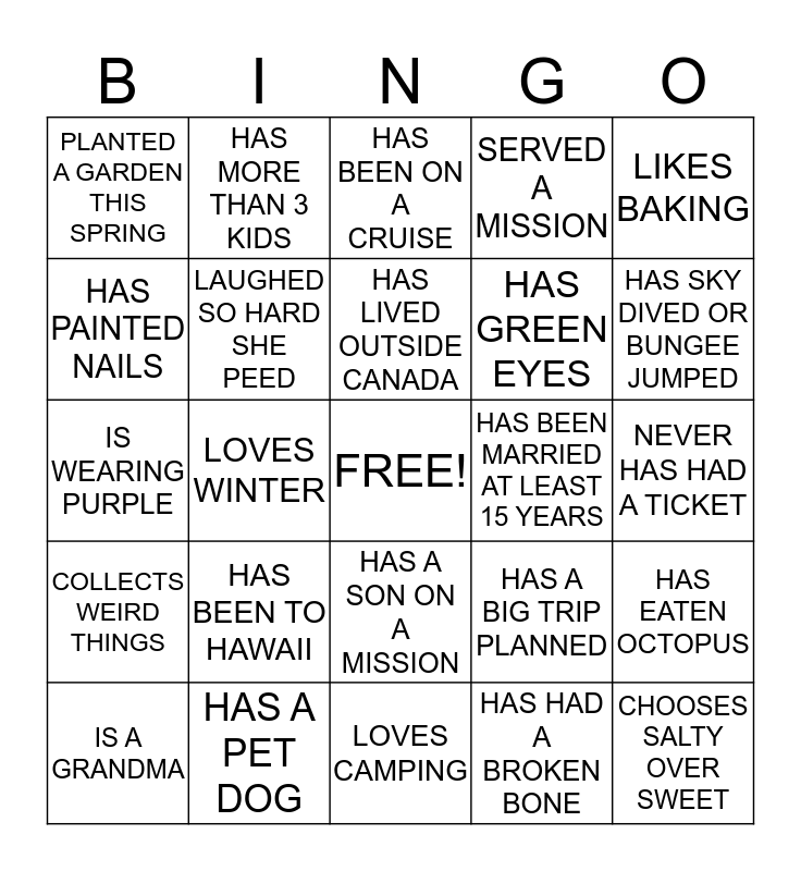This bingo card has a free space and 24 words: HAS BEEN TO HAWAII, HAS A PET DOG, HAS LIVED OUTSIDE CANADA, IS A GRANDMA, LIKES BAKING, PLANTED A GARDEN THIS SPRING, HAS PAINTED NAILS, HAS MORE THAN 3 KIDS, HAS BEEN MARRIED AT LEAST 15 YEARS, HAS A SON ON A MISSION, HAS GREEN EYES, IS WEARING PURPLE, HAS A BIG TRIP PLANNED, HAS EATEN OCTOPUS, LAUGHED SO HARD SHE PEED, HAS HAD A BROKEN BONE, NEVER HAS HAD A TICKET, HAS BEEN ON A CRUISE, HAS SKY DIVED OR BUNGEE JUMPED, LOVES WINTER, CHOOSES SALTY OVER SWEET, COLLECTS WEIRD THINGS, SERVED A MISSION and LOVES CAMPING.