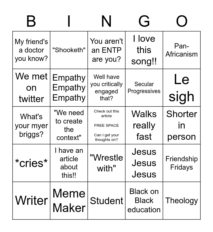 This bingo card has a free space and 24 words: I have an article about this!!, Meme Maker, Well have you critically engaged that?, Writer, Pan-Africanism, My friend's a doctor you know?, We met on twitter, "Shooketh", Walks really fast, "Wrestle with", Secular Progressives, What's your myer briggs?, Jesus Jesus Jesus, Friendship Fridays, Empathy Empathy Empathy, Black on Black education, Shorter in person, You aren't an ENTP are you?, Le sigh, "We need to create the context", Theology, *cries*, I love this song!! and Student.