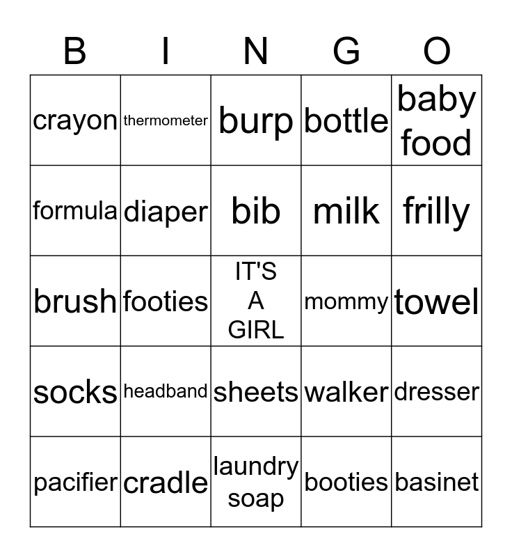 This bingo card has a free space and 60 words: crib, cradle, tub, socks, booties, rhymes, diaper, blanket, milk, safety pin, bottle, lullaby, formula, ducky, spoon, crayon, basinet, baby food, shoes, bib, mommy, burp, pacifier, dresser, baskets, bows, ribbons, lace, frilly, doll, burp rag, wipes, diaper pail, baby bed, thermometer, rattle, onesie, footies, nail clippers, brush, comb, headband, towel, wash rag, walker, stroller, juice, teething ring, play pen, sheets, laundry soap, hangers, shampoo, baby, clothes pins, bottle brushes, pants, shorts, shirts and soap.