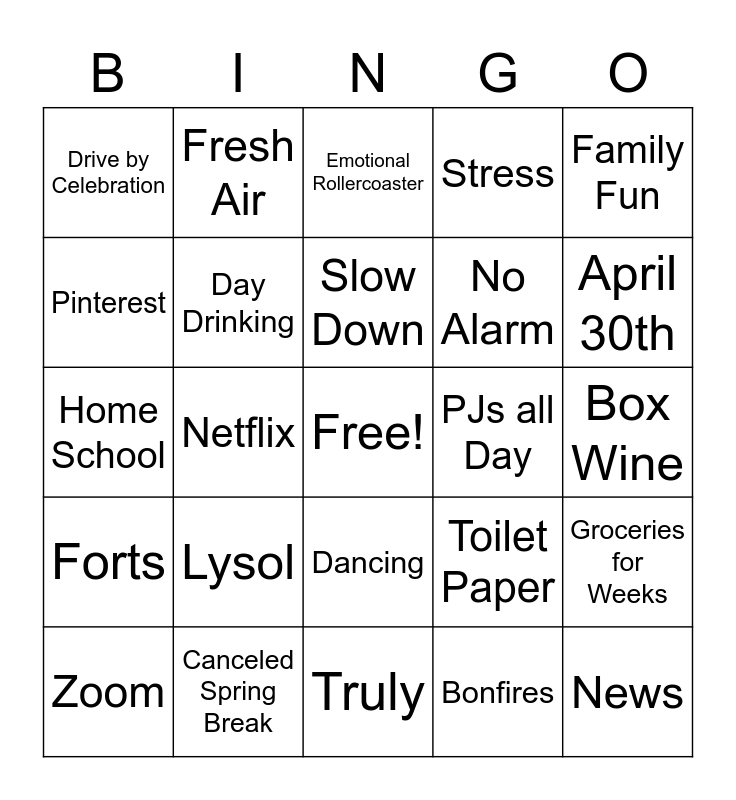 This bingo card has a free space and 24 words: Lysol, Canceled Spring Break, Slow Down, Zoom, Family Fun, Drive by Celebration, Pinterest, Fresh Air, PJs all Day, Dancing, No Alarm, Home School, Toilet Paper, Groceries for Weeks, Day Drinking, Bonfires, Box Wine, Emotional Rollercoaster, April 30th, Netflix, News, Forts, Stress and Truly.