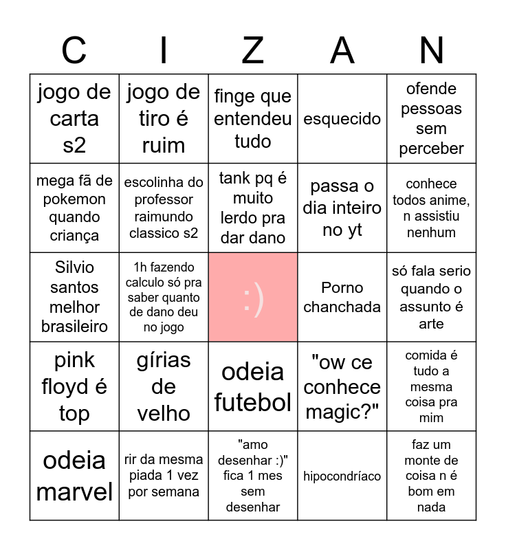 This bingo card has a free space and 24 words: gírias de velho, rir da mesma piada 1 vez por semana, tank pq é muito lerdo pra dar dano, odeia marvel, ofende pessoas sem perceber, jogo de carta s2, mega fã de pokemon quando criança, jogo de tiro é ruim, Porno chanchada, odeia futebol, passa o dia inteiro no yt, Silvio santos melhor brasileiro, "ow ce conhece magic?", comida é tudo a mesma coisa pra mim, escolinha do professor raimundo classico s2, hipocondríaco, só fala serio quando o assunto é arte, finge que entendeu tudo, conhece todos anime, n assistiu nenhum, 1h fazendo calculo só pra saber quanto de dano deu no jogo, faz um monte de coisa n é bom em nada, pink floyd é top, esquecido and "amo desenhar :)" fica 1 mes sem desenhar.