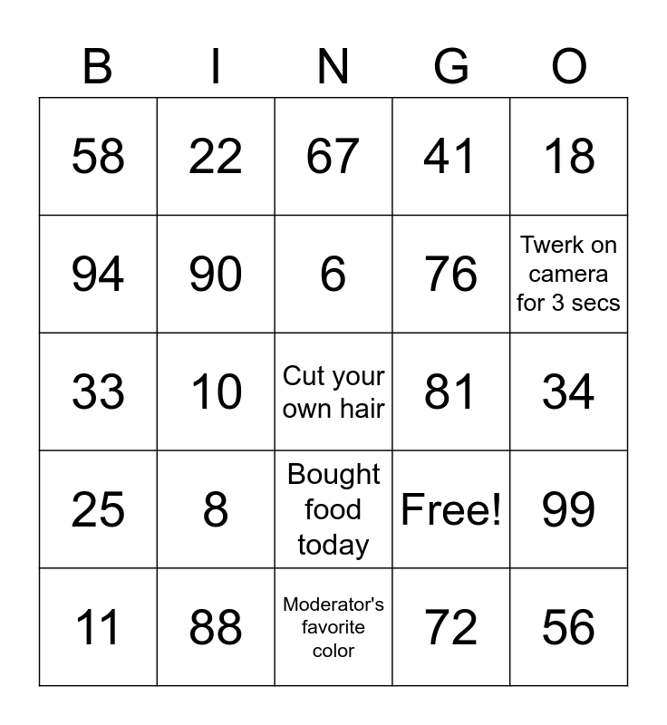 This bingo card has 25 words: 8, Moderator's favorite color, 6, 11, 18, 58, 94, 22, 81, Bought food today, 76, 33, Free!, 99, 90, 56, 34, 67, Twerk on camera for 3 secs, 10, Cut your own hair, 88, 25, 41 and 72.