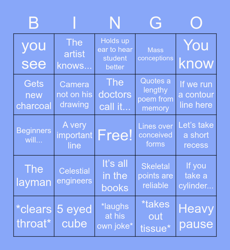 This bingo card has a free space and 24 words: Celestial engineers, 5 eyed cube, The doctors call it..., *clears throat*, You know, you see, Gets new charcoal, The artist knows..., Lines over conceived forms, It’s all in the books, Quotes a lengthy poem from memory, Beginners will..., Skeletal points are reliable, If you take a cylinder..., Camera not on his drawing, *takes out tissue*, Let’s take a short recess, Holds up ear to hear student better, If we run a contour line here, A very important line, Heavy pause, The layman, Mass conceptions and *laughs at his own joke*.