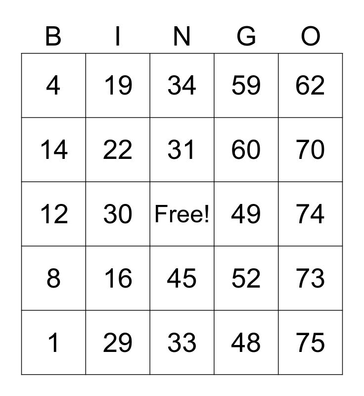 This bingo card has a free space and 24 words: 1, 16, 31, 48, 62, 4, 19, 34, 49, 74, 12, 22, 52, 73, 14, 29, 33, 59, 70, 8, 30, 45, 60 and 75.