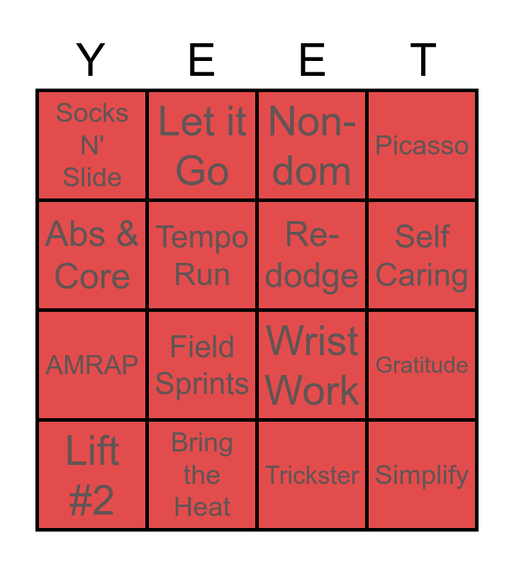 This bingo card has 16 words: Lift #2, Bring the Heat, Non-dom, Picasso, Abs & Core, Let it Go, Wrist Work, Gratitude, Socks N' Slide, Tempo Run, Trickster, Self Caring, AMRAP, Field Sprints, Re-dodge and Simplify.