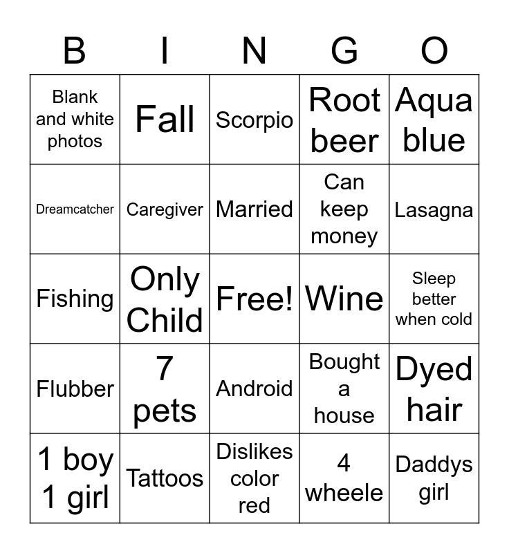 This bingo card has a free space and 24 words: 1 boy 1 girl, 7 pets, Married, 4 wheele, Aqua blue, Blank and white photos, Fall, Scorpio, Wine, Sleep better when cold, Fishing, Caregiver, Bought a house, Dyed hair, Dreamcatcher, Tattoos, Dislikes color red, Root beer, Lasagna, Flubber, Only Child, Android, Can keep money and Daddys girl.