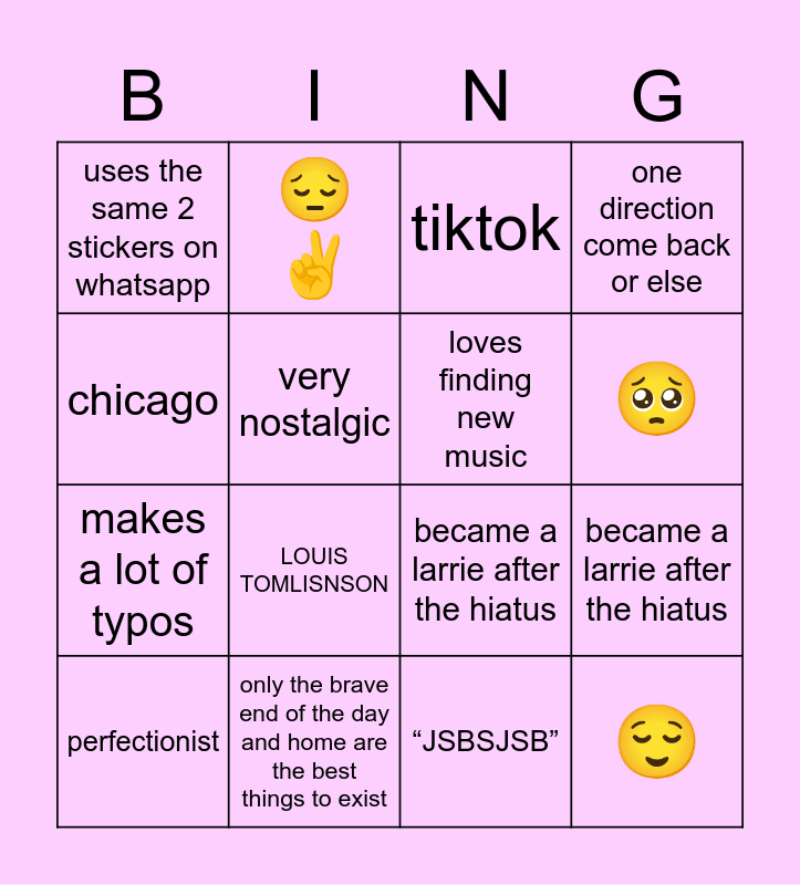 This bingo card has 21 words: only the brave end of the day and home are the best things to exist, peace signs, 😔✌️, i am baby, “JSBSJSB”, loves finding new music, uses the same 2 stickers on whatsapp, tiktok, became a larrie after the hiatus, 🥺, makes a lot of typos, one direction come back or else, 😌, plays an instrument, very nostalgic, memesss, perfectionist, LOUIS TOMLISNSON, chicago, became a larrie after the hiatus and typos but makes fun of other people’s typos.