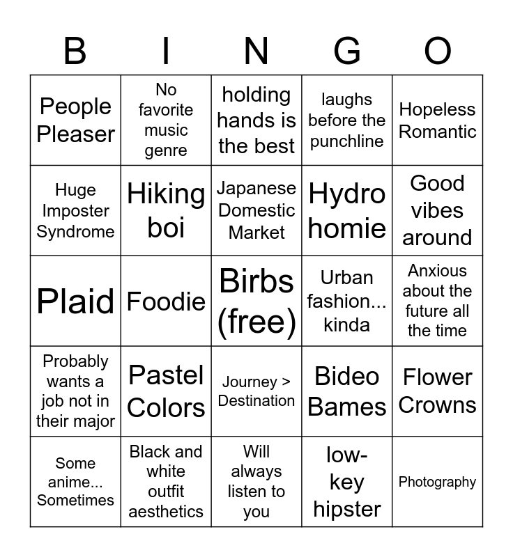This bingo card has a free space and 24 words: Pastel Colors, Black and white outfit aesthetics, Japanese Domestic Market, Some anime... Sometimes, Hopeless Romantic, People Pleaser, Huge Imposter Syndrome, No favorite music genre, Urban fashion... kinda, Journey > Destination, Hydro homie, Plaid, Bideo Bames, Flower Crowns, Hiking boi, low-key hipster, Anxious about the future all the time, holding hands is the best, Good vibes around, Foodie, Photography, Probably wants a job not in their major, laughs before the punchline and Will always listen to you.