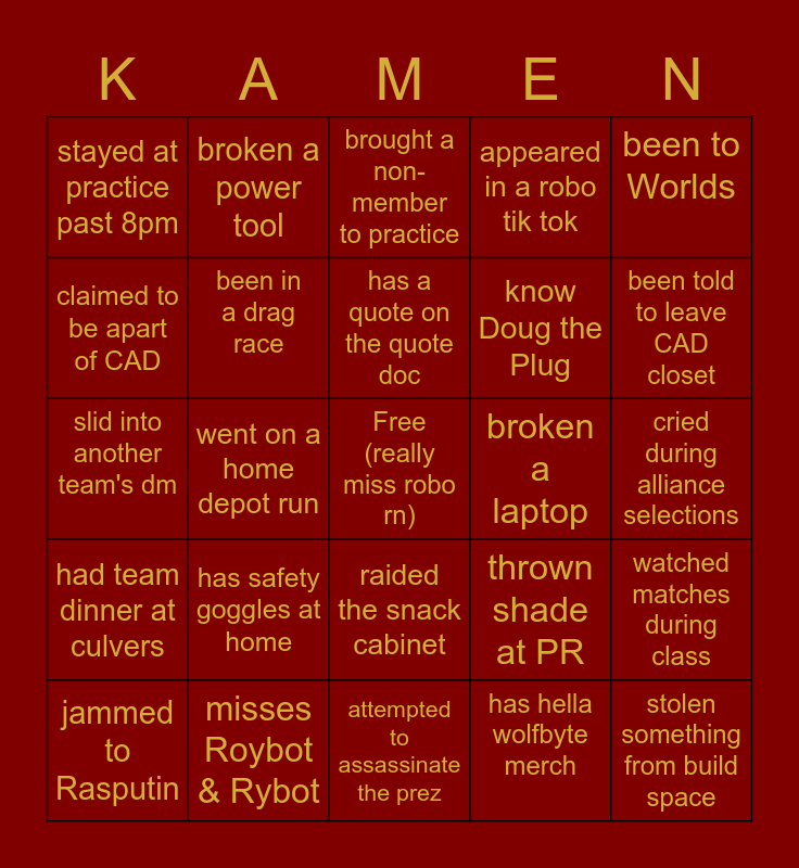 This bingo card has a free space and 24 words: has safety goggles at home, misses Roybot & Rybot, has a quote on the quote doc, jammed to Rasputin, been to Worlds, stayed at practice past 8pm, claimed to be apart of CAD, broken a power tool, broken a laptop, raided the snack cabinet, know Doug the Plug, slid into another team's dm, thrown shade at PR, watched matches during class, been in a drag race, has hella wolfbyte merch, cried during alliance selections, brought a non-member to practice, been told to leave CAD closet, went on a home depot run, stolen something from build space, had team dinner at culvers, appeared in a robo tik tok and attempted to assassinate the prez.