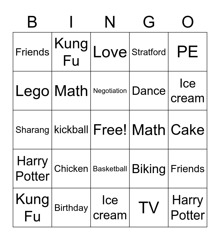 This bingo card has a free space and 46 words: Sharwin, Harry Potter, Lemonade, Ice cream, Chicken, Basketball, Kung Fu, TV, Lego, Dance, Math, Stratford, Friends, Biking, Negotiation, Sharwin, Negotiation, Math, Science, PE, kickball, TV, Friends, Dance, Lemonade, Ice cream, Kung Fu, Lego, Basketball, Harry Potter, Chicken, Biking, Stratford, Travel, Cousins, Birthday, Cake, Chocolate, Fun loving, Creativity, Pokemon, Love, Sharang, Drawing, Movies and Snuggle.