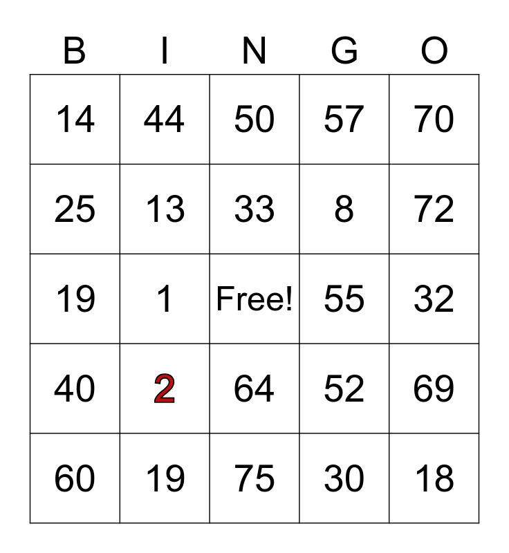 This bingo card has a free space and 24 words: 2, 19, 33, 60, 70, 14, 25, 44, 55, 64, 8, 19, 52, 69, 13, 30, 32, 50, 72, 1, 18, 40, 57 and 75.