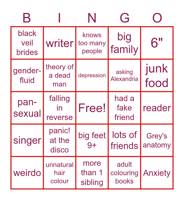 This bingo card has a free space and 24 words: panic! at the disco, unnatural hair colour, depression, weirdo, 6", black veil brides, gender-fluid, writer, had a fake friend, big feet 9+, asking Alexandria, pan-sexual, lots of friends, Grey's anatomy, theory of a dead man, adult colouring books, reader, knows too many people, junk food, falling in reverse, Anxiety, singer, big family and more than 1 sibling.